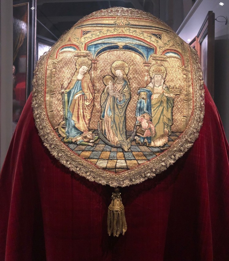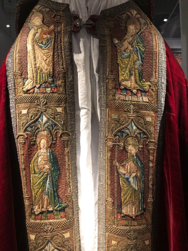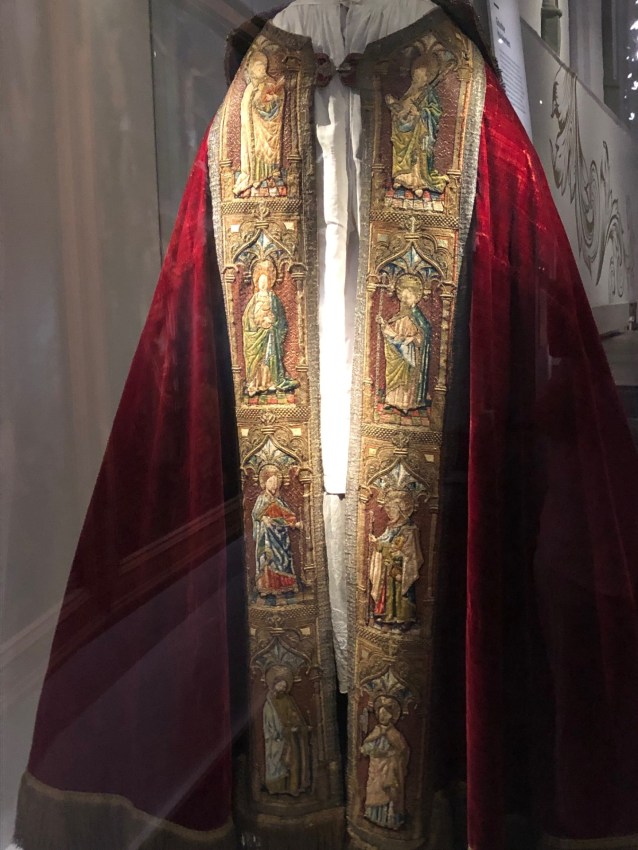 Ik citeer de tekst bij deze Koorkap: ‘De koorkap is een ruime mantel die tijdens katholieke erediensten door geestelijken werd gedragen. Op de aurifriezen, de met gouddraad en zijde geborduurde verticale stroken, zijn acht van de twaalf apostelen afgebeeld.’