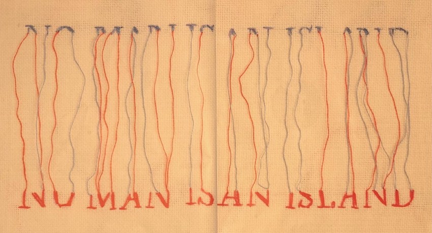 Vertaald luidt de titel: Niemand is een eiland. NO MAN IS AN ISLAND. De kunstenares maakte een perfect beeld om in kleur, draad/lijn, letters en textieltechniek vorm te geven aan het idee dat alles en idereen met elkaar is verbonden.