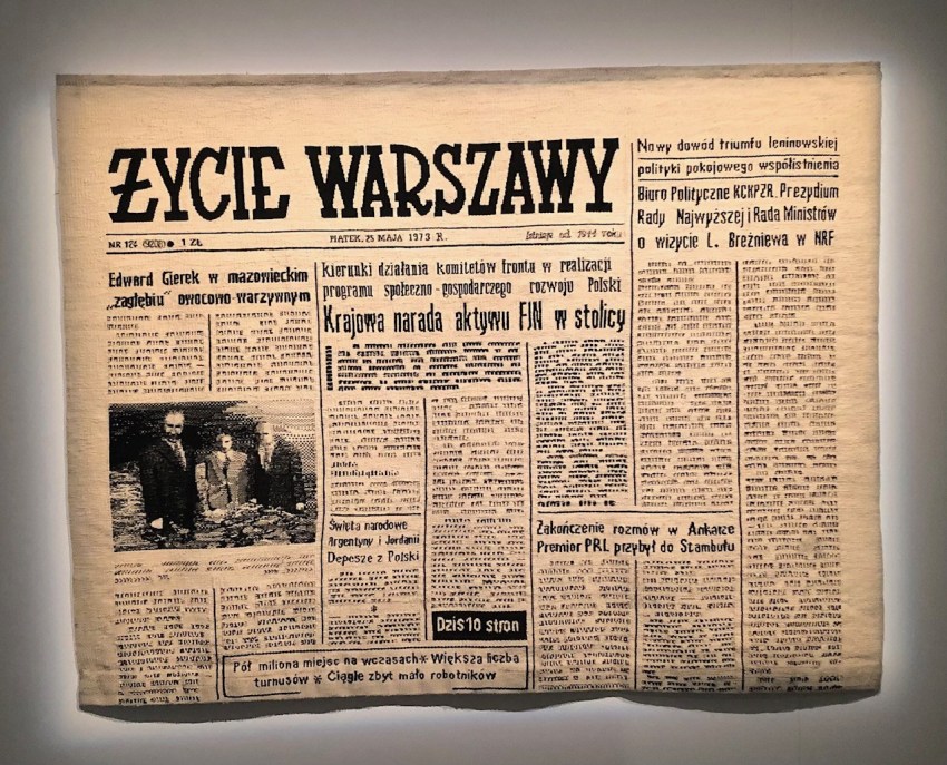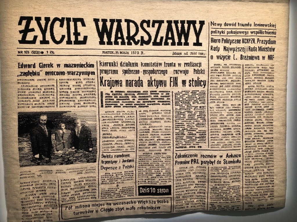 Dit wandkleed toont de voorpagina van het dagblad Zycie Warszawy (Leven in Warschau) van 25 mei 1973.
