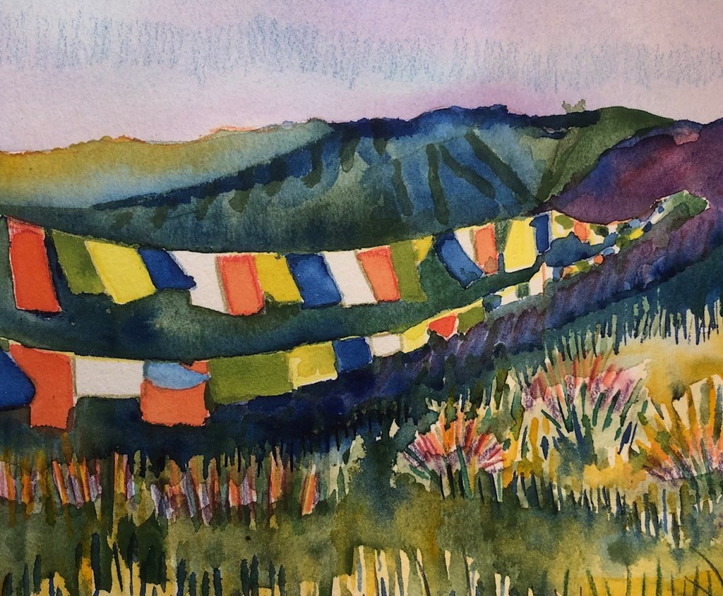 Een eveneens bescheiden verschijningsvorm van een lapje textiel is de gebedsvlag. we kennen ze uit Tibet, maar daarvoor kwamen ze uit India. Ze zijn vierkant. Ze zijn er in vijf kleuren: de drie primaire kleuren en groen en wit. De lapjes wapperen in de wind. Zo zullen de goede wensen de goden, de familie, de vrienden bereiken.