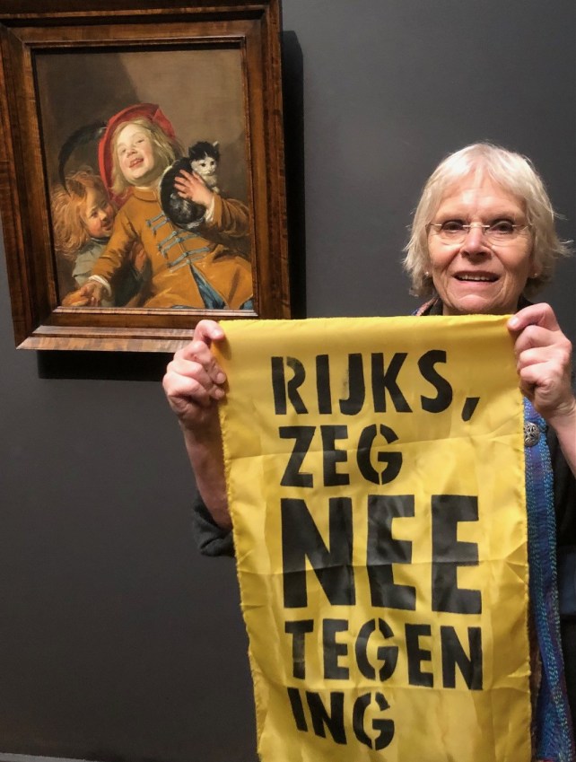Op dezelfde manier lukte het actievoerders om actie te voeren in het RijksMuseum: op een klein geel doekje staat een leus, bedoeld om mensen bewust te maken van Green Washing.