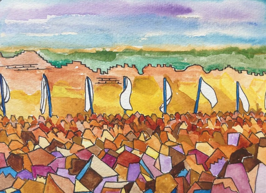De witte vlag: al weer jaren geleden zag ik een foto met daarop de afbeelding hiernaast. Ik maakte deze aquarel vanuit mijn herinnering.