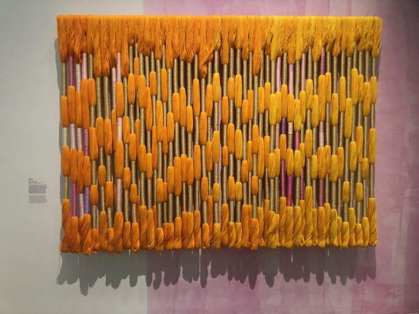 Dit werk van draad was te zien op de tentoonstelling Handwerk en Graffity in september 2024 in het Centraal Museum te Utrecht. Het werk gemaakt met linnen en katoen bestaat enkel uit met draden omwikkelde draden. De verticale draden zijn een soort strengen, zoals we die kennen van de strengetjes borduurzijde. De bovenzijdes van al die strengen hangen om een ronde balk naar beneden. Het werk hangt los van de muur, dus de schaduw werkt ook mee in het effect. In eerste instantie lijken het twee kleuren, geel en goud. Maar bij nadere beschouwing ontdek je vele subtiele kleurschakeringen.