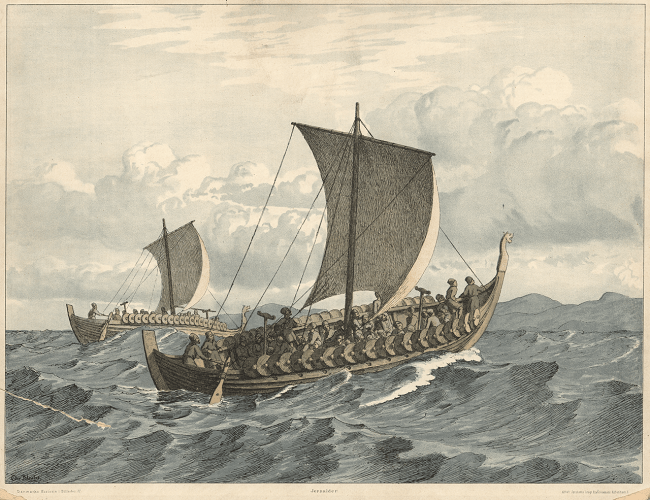 Illustratie: Lithografie van een Vikingschip, gemaakt doot Christian Blache in Jernaldo 1898. Wikimedia Commons. Zelf haalde ik deze afbeelding van Geschiedenis Magazine.
