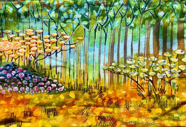 De laatste tijd viel het me op dat ik vaker ‘val’ voor bijna abstracte, kleurrijke werken, gebaseerd op natuur, maar het zit al tegen de fantasie aan. De rechtopstaande stammen van bomen zijn een kenmerkend beeld, maar in het echt zullen we onderstaande landschappen niet tegenkomen.