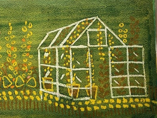 En dit is de laatste versie. Alle afbeeldingen die ik wilde bewaren uit het groen heb ik afgedekt met groen oliepastelkrijt. Daar waar dit oliepastelkrijt zat, komt geen blauwe verf.