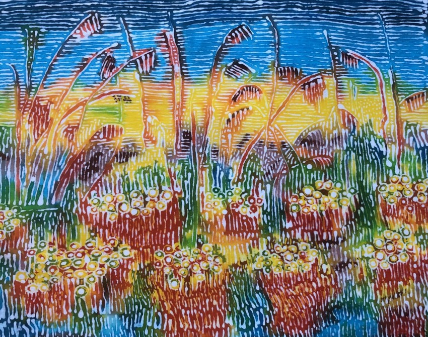 Deze batik hiernaast is eveneens geïnspireerd op riet met dotters. De afmetingen zijn 35 cm x 30 cm. De schets ervoor maakte ik met viltstift.