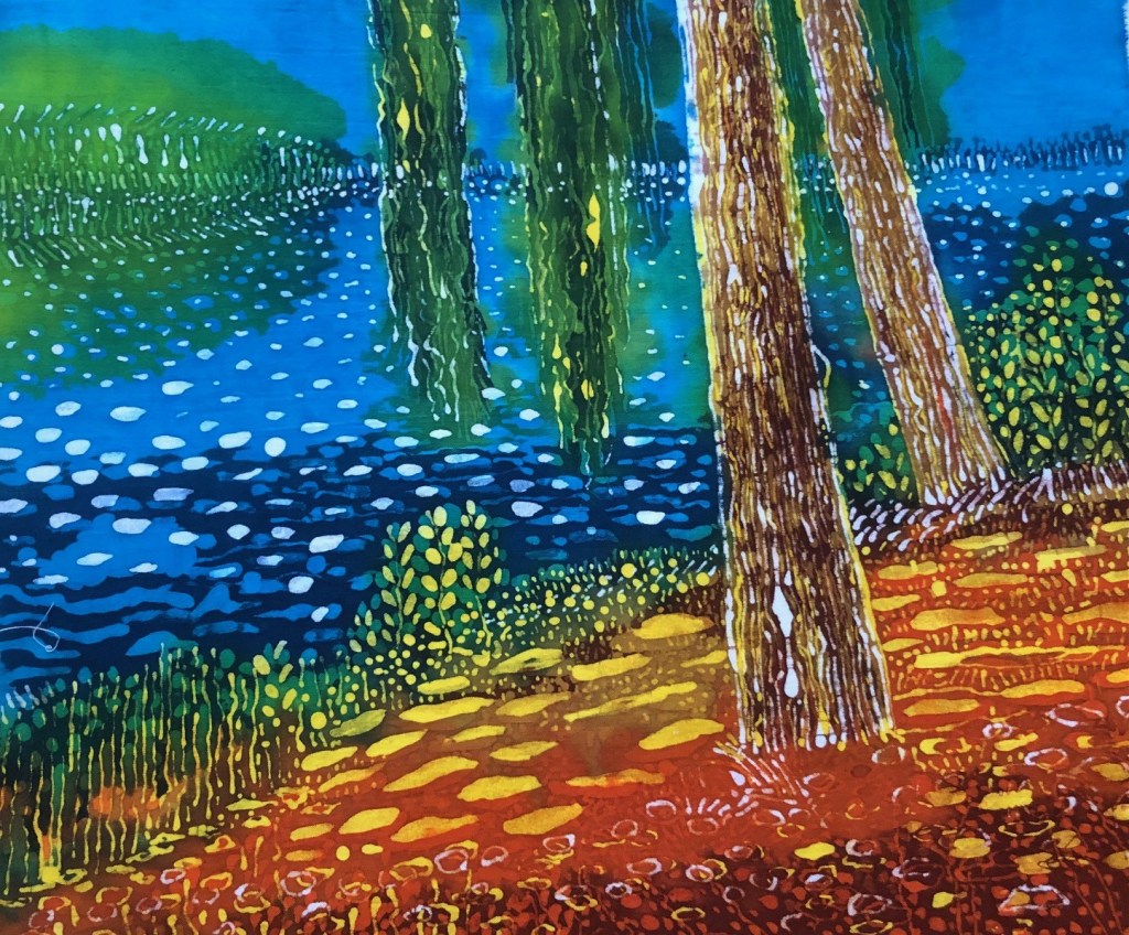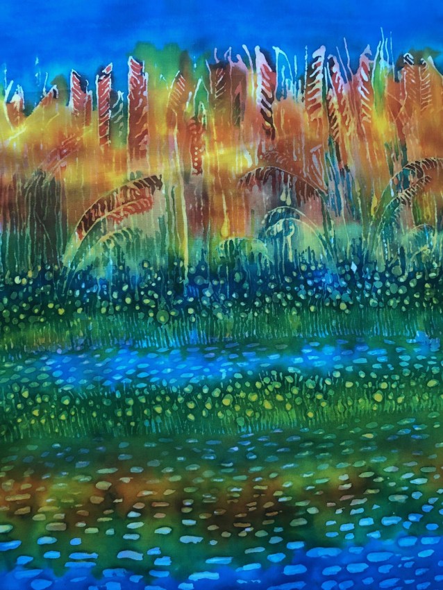Een batik kan immers makkelijk betiteld worden als ‘tsja, een lapje’. Het valt niet te ontkennen dat het dat ook is. Om van die betiteling af te komen, zou ik het werk over een paneel kunnen spannen. Maar als ik het span of plak, dan wordt het statisch en ook wel hard. En riet…wat is er nou beweeglijker, meegaander dan riet. Ik vind textiel een goed materiaal om riet weer te geven.