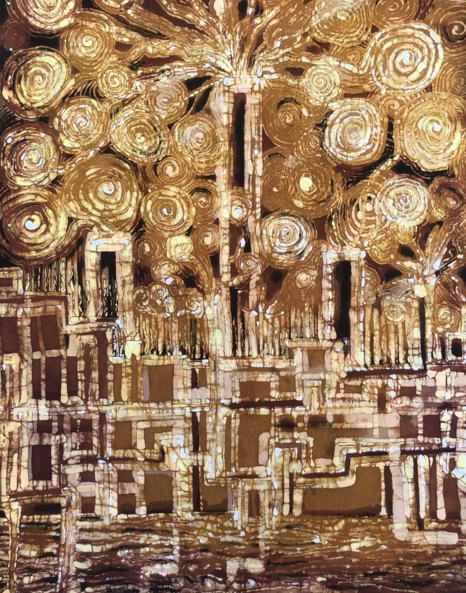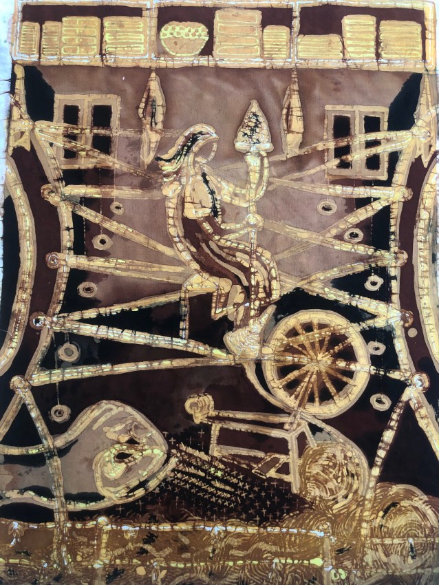 Ook daar maakte ik twee batiks over. Er wordt veel te veel textiel geproduceerd en de grondstoffen voor dat overschot zijn vervuilende fossiele brandstoffen. Niet dat het vroeger hemels was: toen zaten kinderen, vrouwen, meisjes de beste jaren van hun leven te besteden aan het spinnen van de draad. Gevangen in strikjes en corsetten. Trouwens: de meisjes en vrouwen in de kledingfabrieken van nu…..