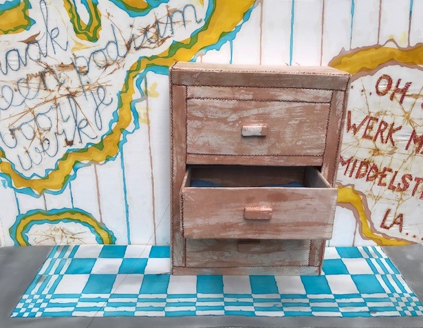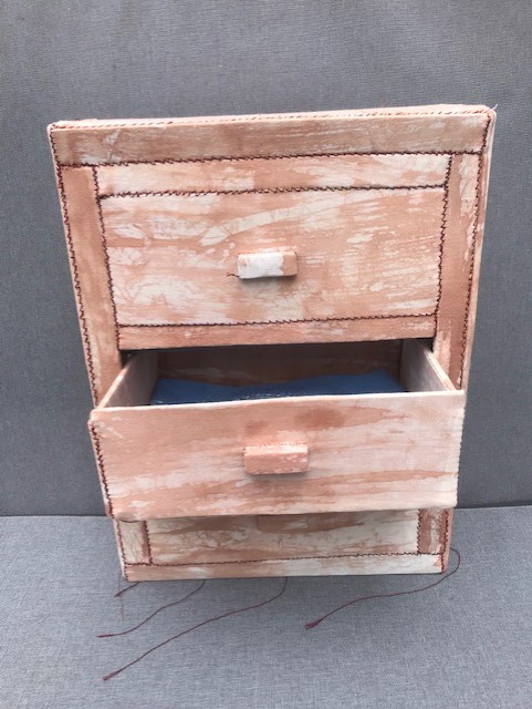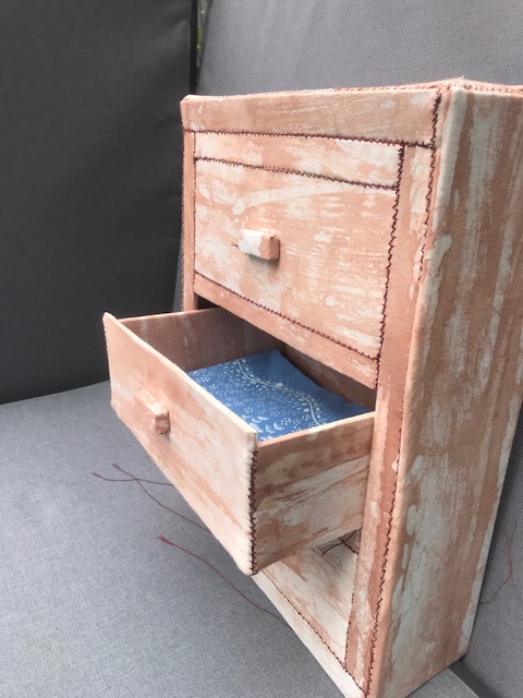 Het kastje heeft wel met textiel te maken, want via batikken heb ik op versleten katoen de houtstructuur nagemaakt. Het stof span ik over plankjes en de plankjes naai ik aan elkaar, zodat een ladekastje ontstaat.