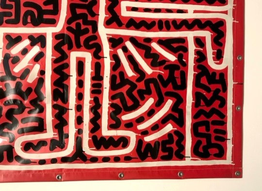 Ik begin met een werk van Keith Haring. In 2020 zag ik in Brussel zijn werk (een stoere vorm tussen schilderij en wandkleed: hij schildert op zeildoek of zelfs vinyl) gepresenteerd via drukknopen op zijn doek, die rechtstreeks pasten op de tentoonstellngswand.