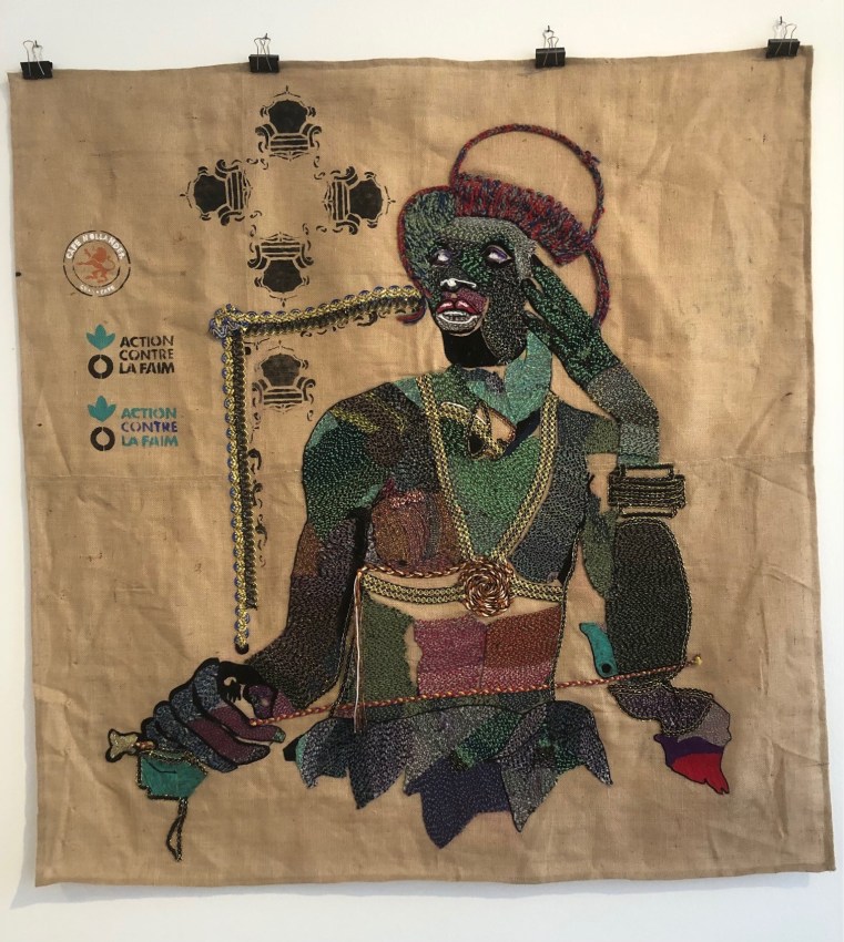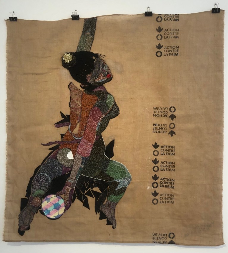 Het kunstwerk hiernaast is gemaakt door Aristote Mago Betsaleel (geboren in 1988 in Kinshasha) heet Effort en is gemaakt in 2022 en opgenomen in de Collectie van Bonnefanten. Het is een rijk geborduurde voorstelling op een jute zak. De uit elkaar getornde zak dient als basis voor het wandkleed. Een hulporganisatie leverde er eens voedsel in tegen de hongersnood.