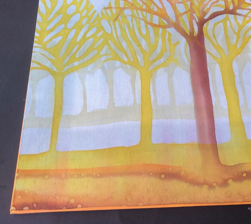Soms doet het een werk goed als het gespannen wordt over een plaat. Er bestaat vernis met een UV-filter die ook kan dienen als lijm. Ik smeer een witte plank in met de vernis en het wandkleed kan onlosmakelijk over de plank worden gespannen.