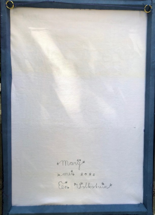 Ik vind zelf dat het textiele werk meer gaat spreken wanneer het een eigen kader heeft. Het staat een beetje los van de wereld. Het is een textiel wereldje apart.
