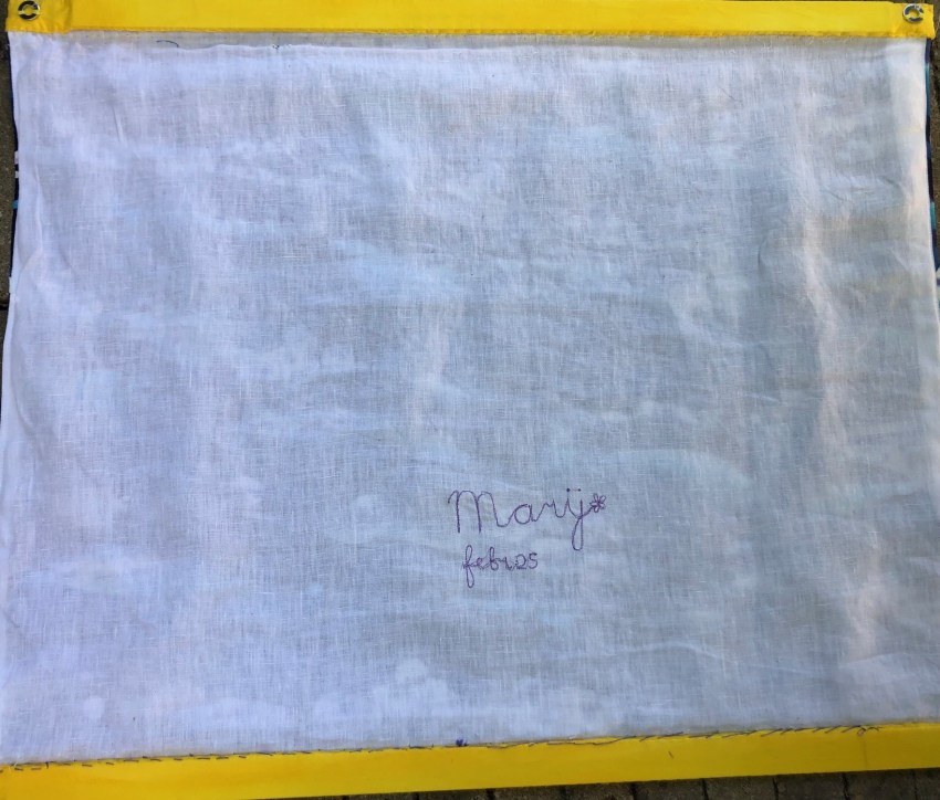 Be seen – feel seen. Alle stoffen zijn gebatikt. De stoffen zijn over houten planken gespannen, de houten planken worden via het textiel met naald en draad verbonden. Afmetingen van de achterwand 90 x 70 cm. De diepte is 30 cm.