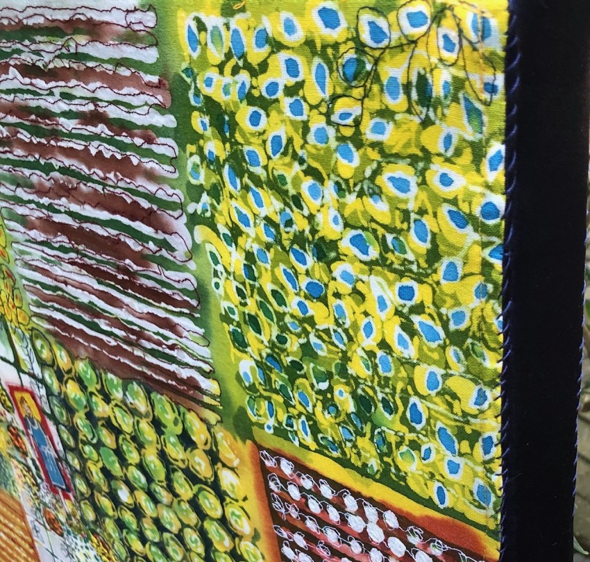 Ik ontdekte: wanneer ik houten latjes bekleed met stof dan kan ik die houten latjes met naald en draad aan elkaar verbinden. Dan heb ik een frame, waarover ik het werk strak kan spannen. Vervolgens ontstaat er een buitenrand van enkele centimeters, waarover ik satijnband in een contrasterende kleur kan bevestigen. De constructie wordt steeds sterker.
