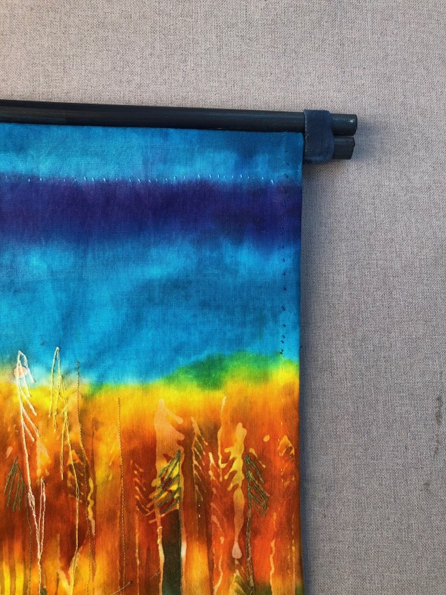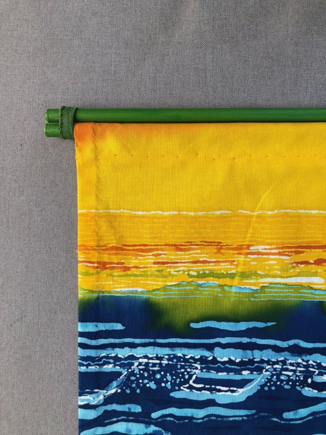 tot voor kort: wanneer ik een kleine batik maakte dan zoomde ik het lapje en ik schoof een geverfd rond latje door een tunneltje boven en beneden. En dan nóg weer een rond latje daarboven.
