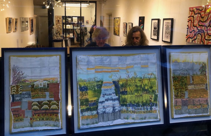 Drie van mijn werken staan in de etalage: Lente, zomer en herfst in de volkstuin.