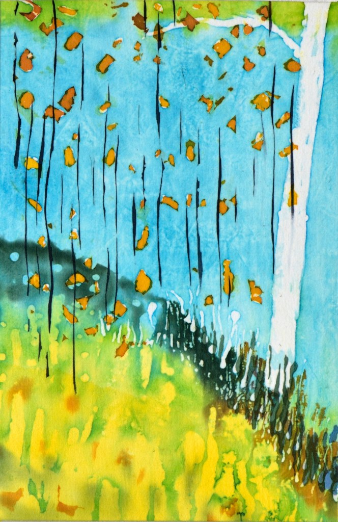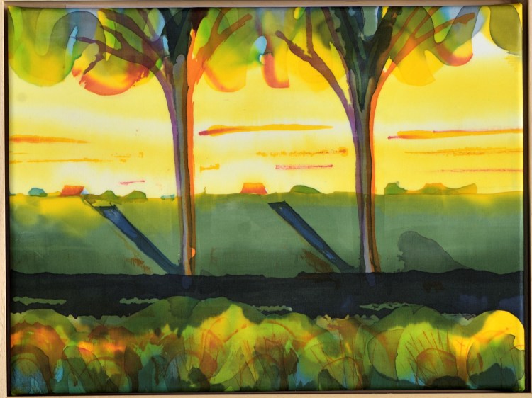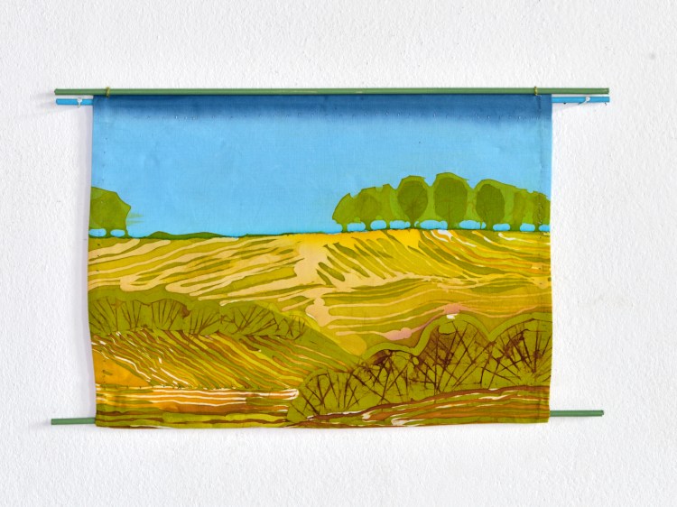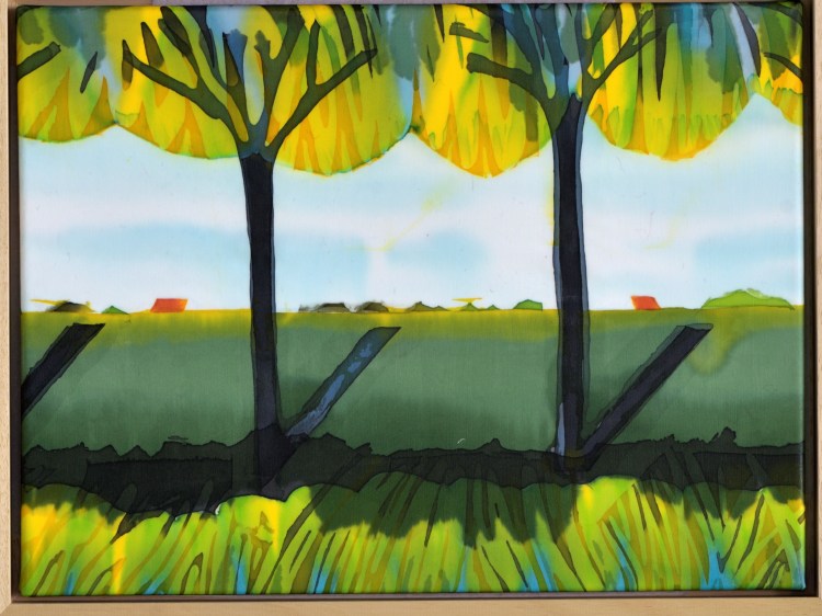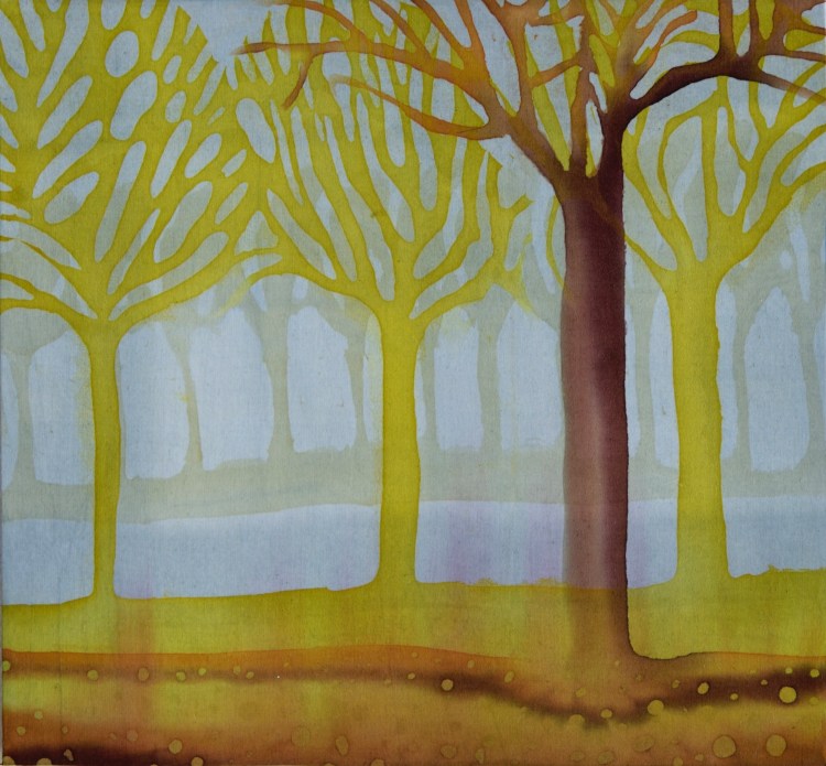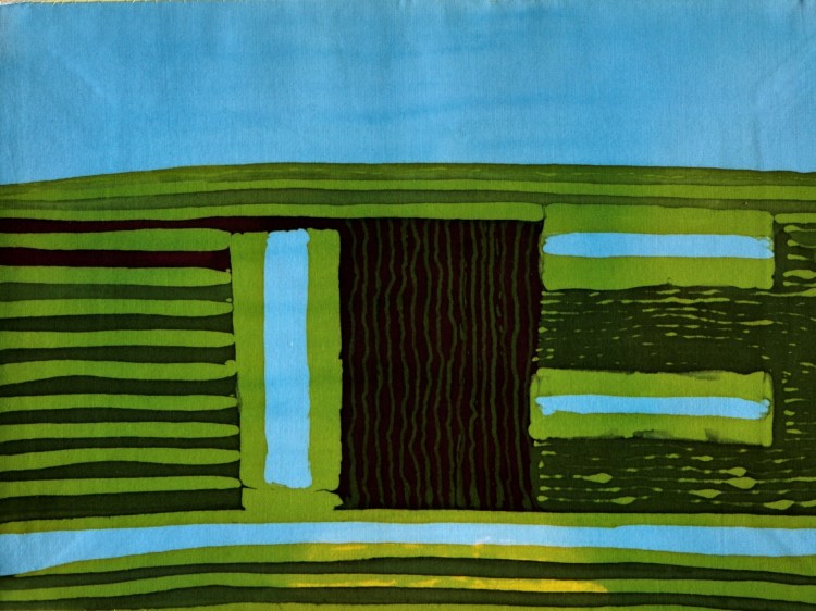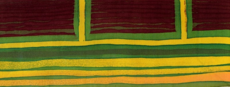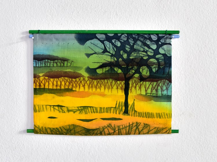 Onderstaande batiks maakte ik enkele jaren geleden als studie. Ze zijn ongeveer 25 x 30 cm groot. Ik werkte ze eenvoudig af: een naadje aan de zijkant en een gekleurd rond stokje in het omgeslagen randje aan boven- en onderkant.